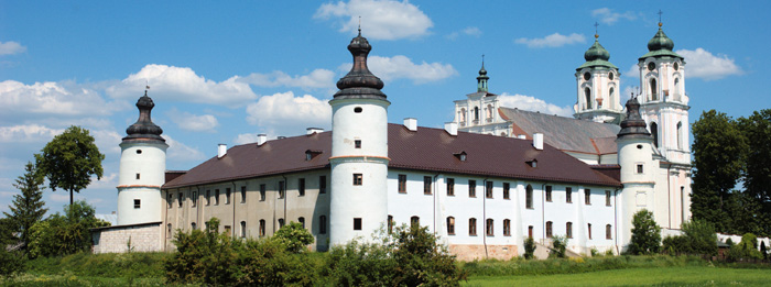 Klasztor powstał jako budynek trzyskrzydłowy, dwukondygnacyjny, flankowany w narożach okrągłymi basztami zwieńczonymi hełmami, zamknięty od wschodu fasadą kościoła, tworząc wewnątrz typowy wirydarz. Budowę klasztoru rozpoczęto około 1619 roku, po zakończeniu podstawowych prac przy wznoszeniu kościoła klasztornego. Prace budowlane i wykończeniowe budynku klasztoru trwały do schyłku XVII wieku. Budynek był przykryty czerwoną dachówką i posiadał wysokie i strome połacie dachowe. W latach 1863-1869 pokrycie dachu zmieniono na blachę, zmieniono równocześnie więźby dachów, spłaszczając je. Powiększono w tym czasie otwory okienne. Pierwotne okienka ujęte w uszaste opaski zachowały się jedynie w wieżach. Cele zakonników i korytarze posiadały i zachowały krzyżowe sklepienia.