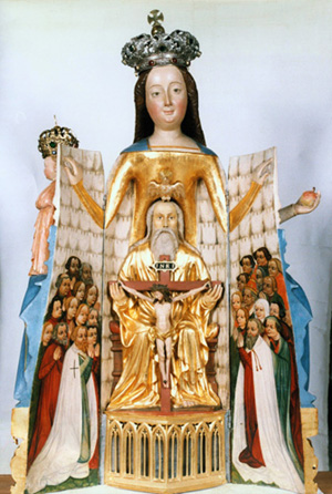 Figura wraz z cokołem posiada 145 cm wysokości (bez korony), jest misternie wyrzeźbiona w lipowym drewnie i przedstawia postać Matki Boskiej siedzącej na tronie, trzymając Dzieciątko Jezus u prawego boku. Rzeźba jest otwierana na boki od szyi Matki Boskiej aż do podstawy, tworząc płaszcz opiekuńczy, podtrzymywany rękoma Maryi. Wewnątrz płaskorzeźba wyobraża Boga Ojca siedzącego na tronie łaski, który trzyma krzyż ze zmarłym Jezusem Chrystusem. Nad głową Boga Ojca jest Duch Święty w postaci gołębicy. Na otwartych bokach płaszcza Matki Boskiej widnieją malowidła 26 postaci różnych stanów, 13 po prawej i po lewej stronie.