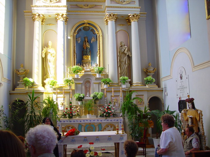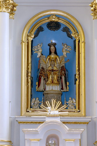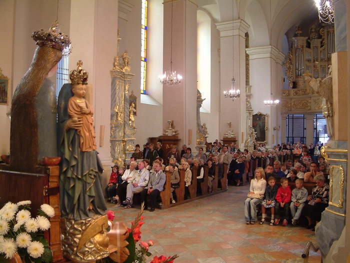 W roku 1610 dominikanie rozpoczęli budowę dużego murowanego kościoła klasztornego. Jesienią 1619 roku, w uroczystej procesji wniesiono do niewykończonej jeszcze budowli kościoła cudowną figurę Matki Boskiej, którą umieszczono we wnęce głównego ołtarza. Wnęka była wyłożona brokatami, obramowana złoceniami i zwieńczona baldachimem z kosztownymi wisiorami. Z upływem lat, figura była obwieszana coraz nowymi wotami, dowodami odebranych łask. Na figurę nałożono szczerozłote korony przyozdobione drogocennymi kamieniami. Wykonano w srebrze płaskorzeźby 6 aniołków, z których jedna para podtrzymywała koronę Matki Boskiej, druga para aniołków podtrzymywała baldachim, zaś trzecia para klęczących ze świecami aniołków była ustawiona u podstawy figury.